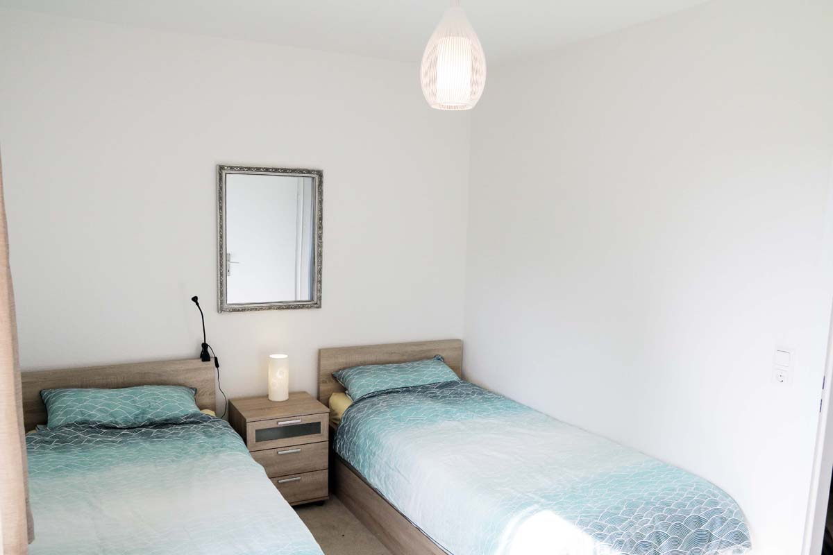 Zwei zusammenschiebbare Einzelbetten und Kommode