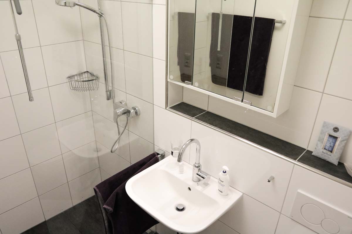 Bad mit ebenderdiger Dusche und WC